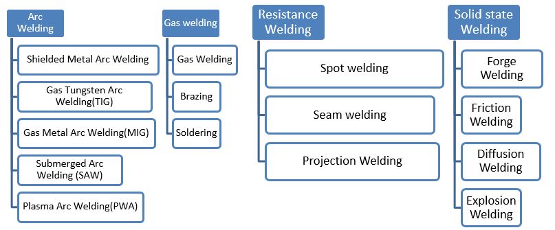 The number of different welding processes has grown up in recent years. These processes differ in the manner in which heat & pressure are applied & the type of equipment used. Which welding process is applicable depends on the types of materials, dimensions, thickness, size & shape, available welding position, joint preparations, available power source, quality levels & economics etc.
